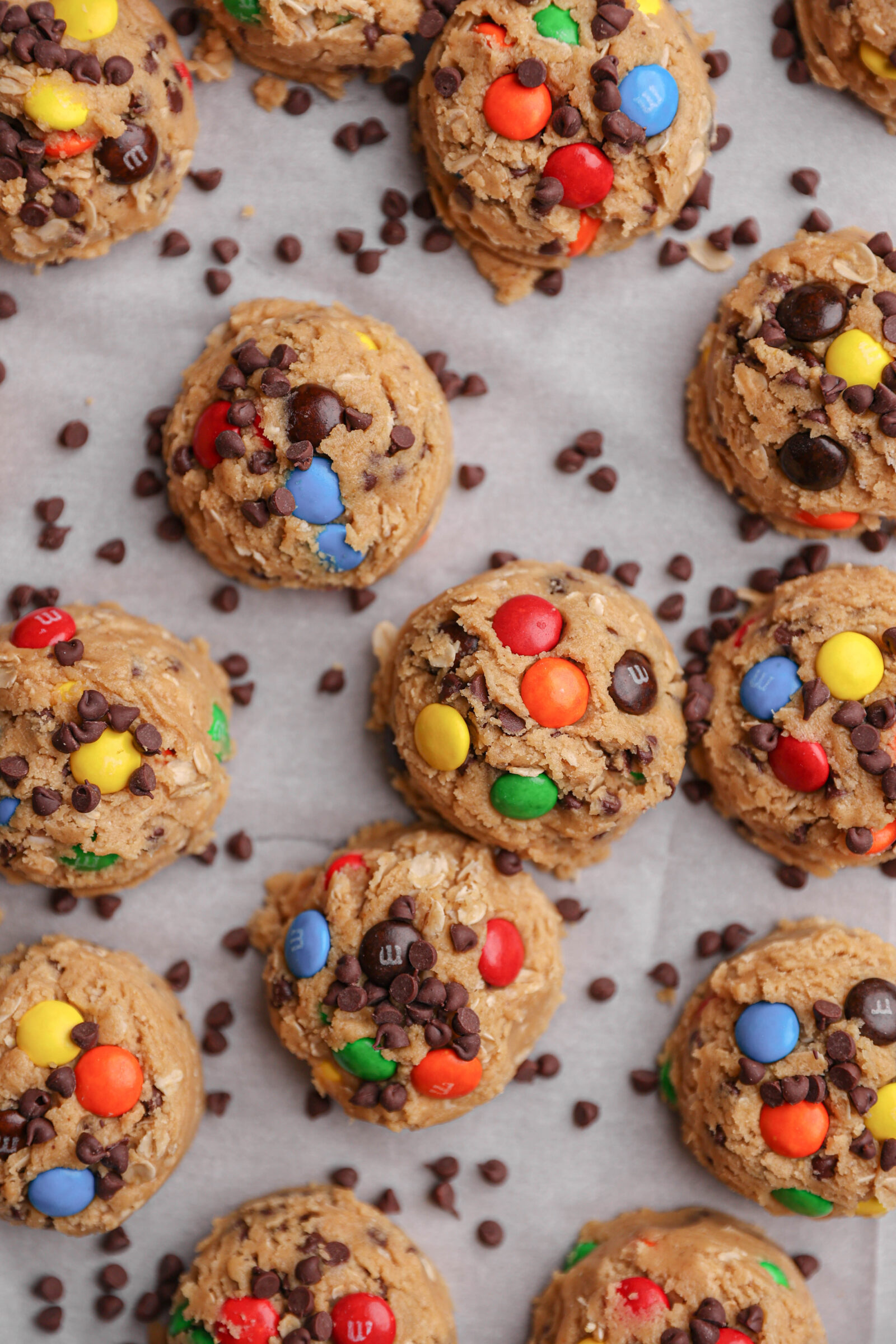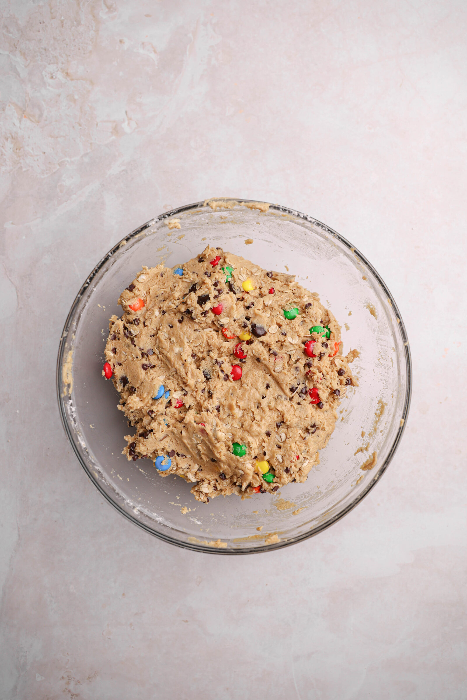 - Add the dry ingredients to the wet ingredients and slowly beat until a dough forms. Add the oats and fold together until combined. Then add the chocolate chips (I like using mini!) and M&Ms and fold together until fully incorporated.