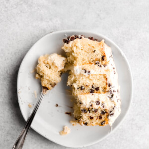 This cannoli cream cake has three fluffy vanilla cake layers studded with mini chocolate chips, a classic ricotta cannoli filling, and a fluffy mascarpone frosting. Each slice is the perfect amount of sweetness, but with a slight tang from the ricotta cheese, and the added texture from the mini chocolate chips.