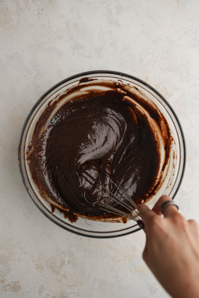 STEP 4: Combine wet ingredients. Pour the cooled chocolate mixture into the egg mixture and whisk until fully combined.
