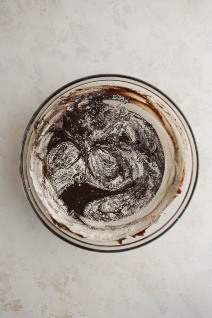 STEP 5: Add dry ingredients. Fold in the flour until just combined. The batter will be thick and glossy.