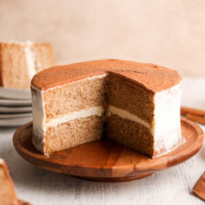 This chai latte cake has the softest cake layers that are made with chai & french vanilla flavors, topped with a french vanilla mascarpone frosting, and lightly dusted with cocoa powder.