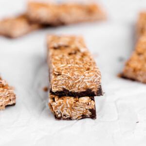 If you grew up eating Quaker Chewy bars like me, you are going to LOVE these granola bars. They are the perfect snack – a little bit of peanut butter and honey/maple syrup to hold them together, loaded with chocolate chips, and completed with a thin layer of chocolate on the bottom. They’re addicting.