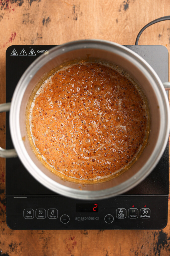 STEP 2: Add the cubed butter. Once the sugar is completely melted, add the cubed butter to the pan. Be cautious as the mixture will bubble up. Whisk vigorously until the butter is melted and mixed with the liquid sugar. Let the mixture bubble for 30-60 seconds while stirring occasionally.