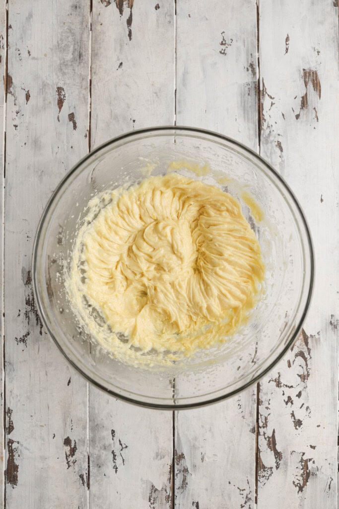 - Mix in eggs, vanilla, and lemon extract.2 eggs, 1 teaspoon vanilla bean paste or extract, ½ teaspoon lemon extract