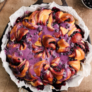 These twisted blueberry rolls are made with a fluffy brioche dough, a jammy, wild blueberry filling, and topped with a sweet blueberry glaze. These rolls are a perfect weekend baking project for a blueberry lover to enjoy for brunch or dessert!